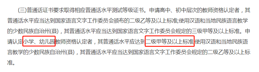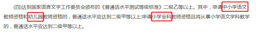 也有要求跟严格的省份,比如安徽省2020年春季教师资格证认定公告规定:申请中小学语文教师资格和幼儿园教师资格的,普通话水平应达到二级甲等以上;申请小学全科教师资格且将从事小学语文学科教学的,普通话水平应达到二级甲等以上。