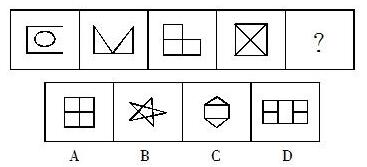 3.【参考答案】D。观察题干图形发现,图形的封闭区域数为1、2、3、4,因此下一个图形应该有5个封闭区域,答案为D。